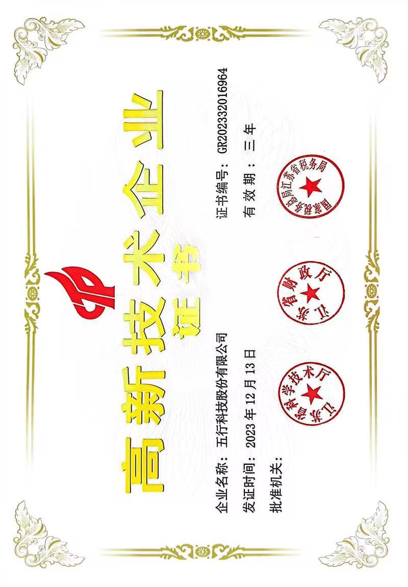 五行科技注重科技研發(fā),持續(xù)多年高投入、高產(chǎn)出,累計形成并轉(zhuǎn)化科技成果達(dá)300多項,自2008年至今一直被科技、財政、稅務(wù)聯(lián)合認(rèn)定為“高新技術(shù)企業(yè)”,是知識密集、技術(shù)密集的經(jīng)濟(jì)實體。